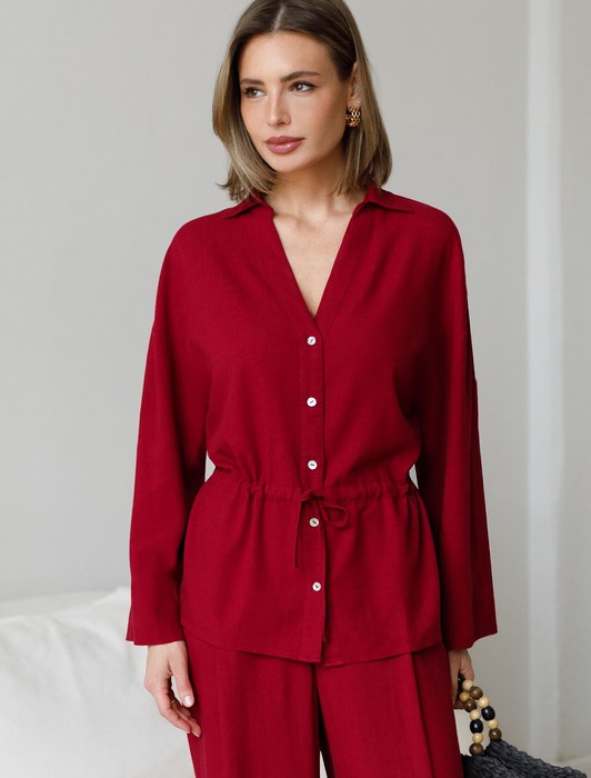 Состав: 70%Вис 30%Лен Плотность: 200 Г/м2Свободная блузка гранатового цвета с кулиской на талии изо льна с вискозой, плотностью 200 Г/м2 - идеальный вариант для весны и лета. Сочетание льна и вискозы обеспечивает комфорт и прохладу в жаркие дни. Материал хорошо драпируется и мягко прилегает к фигуре, создавая струящиеся складки. Эта эффектная блузка сочетает в себе современный крой, удобство и стиль. Отложной воротник придает образу элегантность, спущенная линия плеча — модный и расслабленный акцент, а широкий рукав создает красивый и воздушный силуэт. Талия оформлена утягивающей кулиской, что позволяет регулировать посадку — создайте акцент на поясе для женственного силуэта или носите свободно для комфорта, отлично скроет возможные недостатки. Пуговицы по всей длине делают льняную рубашку особенно практичной, вы можете носить ее растегнутой, как верхний слой. Эта легкая блузка подходит для повседневного гардероба, смотрится красиво и стильно, обеспечивая максимальное удобство, подойдет и на большие размеры.