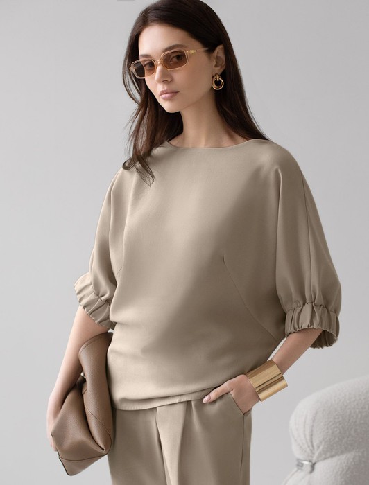 Состав: 76%Лиоцелл (Вис) 24%ПЭСвободная блузка светло-бежевого цвета выполнена из плотного лиоцелла. Лиоцелл это более дорогой и экологичный вариант вискозы, очень прочный и шелковистый. Современная интерпретация кроя «летучая мышь» дополнена акцентными эластичными манжетами. Эта блузка идеальна для любого типа фигуры, в том числе и на королевские размеры. Этот крой создан для того, чтобы мягко скрыть лишние объемы. Эта повседневная блузка с вырезом лодочка создана для легкого и утонченного стиля. Мягкие линии кроя создают невероятно эффектный образ, который подчеркивает естественную красоту, не стесняя движений, а свободный фасон дарит ощущение абсолютного комфорта и уверенности. Блузка красиво драпируется при движении, создавая летящий, воздушный эффект.