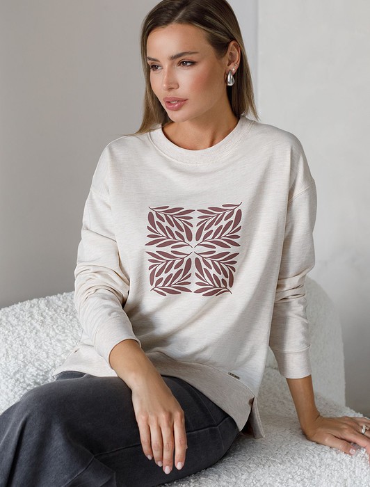 Состав: 95%Хлопок 5%ПУ Плотность: 240 Г/м2Стильный свитшот бежевого цвета с эффектом меланж из премиального футера двухнитки с эластаном сочетает в себе комфорт и оригинальность. Джемпер выполнен из натурального хлопка, который обеспечивает мягкость и дышащие свойства ткани. Нежный материал дарит ощущение уюта в любое время года, а премиальное качество изготовления гарантирует долговечность и сохранение формы после множества стирок. Особенность изделия — спущенная линия плеча и аккуратные разрезы, которые добавляют современный акцент и делают образ более выразительным. Принт в виде листиков придает индивидуальность, позволяя выделиться без лишней вычурности. Дополнен металлическим логотипом бренда.