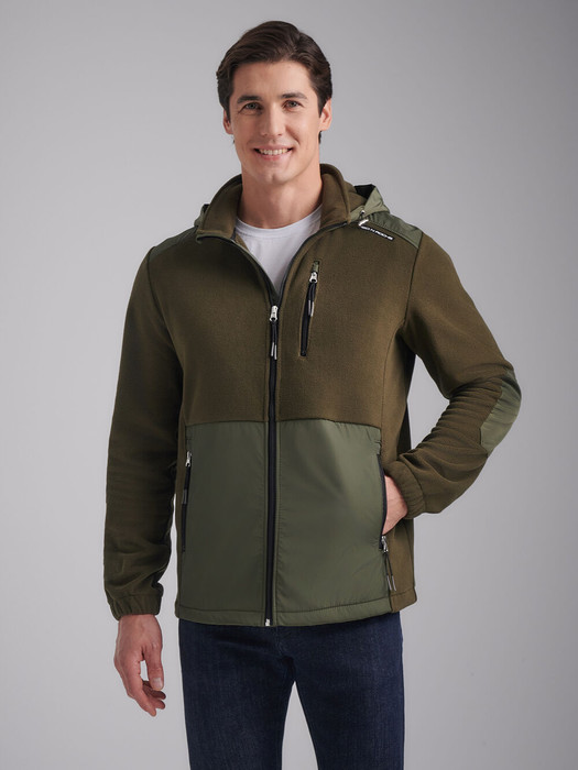 Толстовка мужская из флиса с капюшоном. Низ куртки и низ рукавов выполнены с эластичной рибаной. Толстовка с накладными карманами "кенгуру". Рукава "реглан". По всем швам выполнена отделочная строчка. По низу толстовки расположен, вдоль шва притачивания пояса настрочен шеврон с фирменным логотипом. В капюшоне расположены декоративные шнуры.