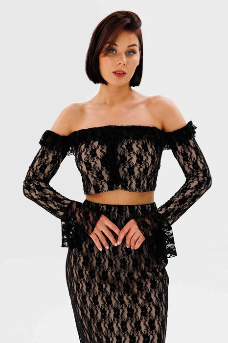 Топ выполнен из эластичного гипюра. Верх лифа и верх рукава обработан резинкой и притачен волан. По центру лифа обработан волан. Топ обработан трикотажной эластичной подклакой. По низу рукава притачен волан со скошенным срезом
