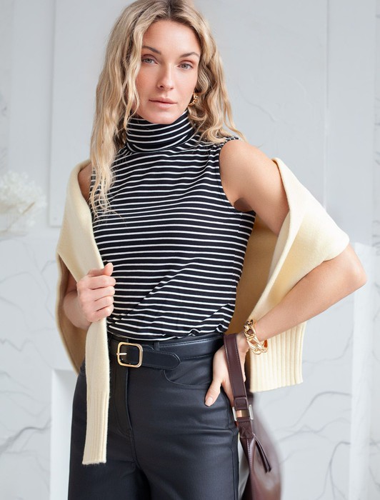Состав: 92%Хлопок 8%ПУ Параметры модели на первом фото: Рост 170, бюст 89, талия 63, бедра 92Топ с воротом как у водолазки выполнен из премиального хлопка. Наличие эластана в составе изделия способствует формоустойчивости. Модель хорошо будет сочетаться в комплекте с жакетом или кардиганом, так как отсутствие рукавов позволит комфортное использование в многослойных образах. Из украшений металлический логотип бренда.