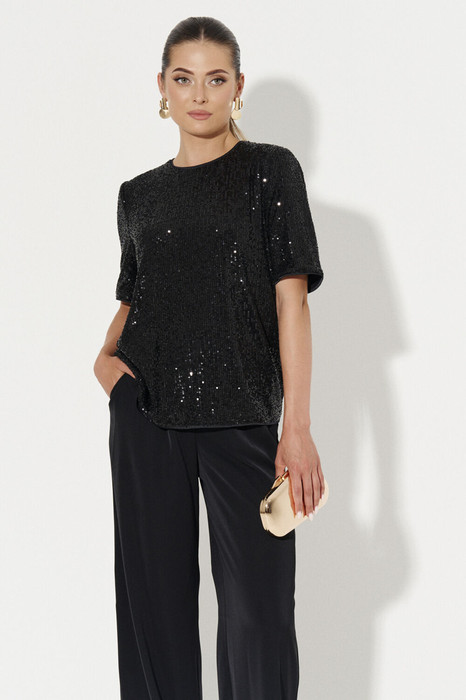 Блузка женская из ткани в пайетки с натуральной вискозной подкладкой. Блузка прямого силуэта для торжественных мероприятий. Низ изделия и горловина блузки обработаны каймой из сетки. Рукав длиной до уровня локтя, низ рукава обработан каймой из сетки. Отличный вариант для тех, то любит носить качественные изделия с натуральной и дышащей подкладкой, а особенно для тек, кто выбирает всегда выглядеть шикарно. Блузка станет замечательным выбором для вечернего образа, который будет очаровывать всех своей изысканностью.