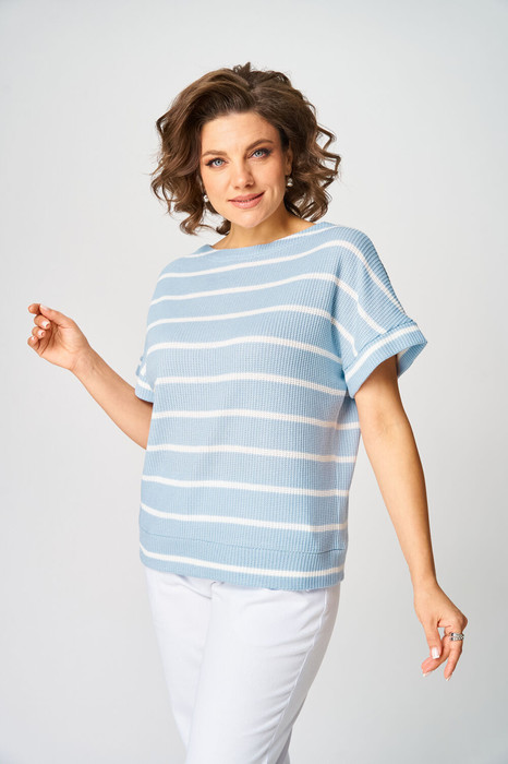 Джемпер женский из трикотажной вязаной ткани. Свободного силуэта. Спущенное плечо, оформлено притачной манжетой. Низ джемпера оформлен притачным поясом. Вырез горловины по спинке треугольный.