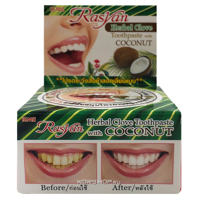 Травяная зубная паста с гвоздикой и кокосом от торговой марки Rasyan экономично расходуется и имеет удобный для путешествий компактный формат. Она предотвращает развитие кариеса, борется с воспалениями и кровоточивостью десен. Также средство отлично отбеливает эмаль и позволяет добиться идеальной голливудской улыбки. Купить травяную зубную пасту с гвоздикой и кокосом Rasyan с доставкой на дом по Москве и Подмосковью можно в интернет-магазине KorShop.ru.