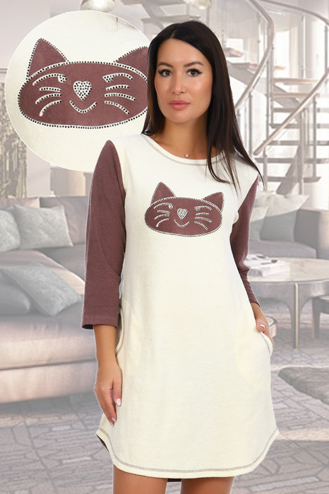 Туника домашняя с принтом и стразами, рукавом 3/4, карманами в боковых швах. Вход в карман, горловина и низ изделия подшиты контрастной строчкой.