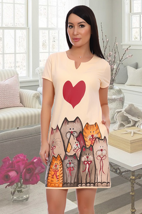 Домашняя туника из свободного силуэта, фигурный вырез горловины. На полочке печать