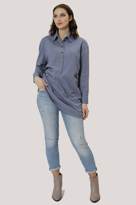 Трикотажная туника из полотна «кулирная гладь» прямого силуэта. Отложной воротник с цельнокроеной стойкой. Застежка-планка на 5 пуговиц. Длинные рубашечные рукава с защипами по низу и притачными манжетами. Манжеты застегиваются на петлю и пуговицу. В боковых швах карманы. Низ туники у боковых швов закруглен.