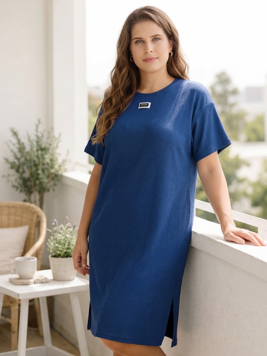 Туника женская из гладкокрашенного трикотажного полотна «бурумчук», прямого силуэта, с короткими втачными рукавами, горловиной овальной формы, обработанной втачной планкой, с разрезами в боковых швах. По центру полочки ниже горловины - настрочен декоративный элемент-нашивка.