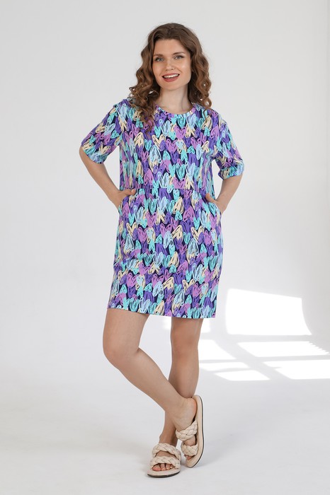 Туника молодежная из набивного трикотажного полотна «кулирка» свободного покроя, с короткими втачными рукавами, горловиной овальной формы обработанной притачной бейкой. Перед отрезной по линии талии, в нижней части располагаются карманы.