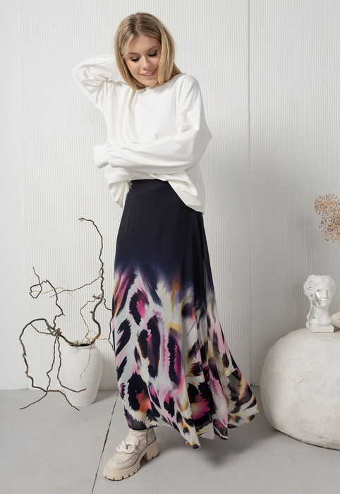 Шифоновая широкая длинная юбка с интересным многоцветным купонным принтом. Изделие на притачном поясе с застежкой на тесьму-молнию по спинке. Подкладка из натурального вискозного трикотажика.