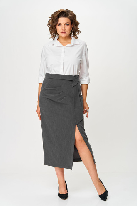 По передней половине юбки выполнены складки и левой стороны вертикальный шов, в нижней части которого обработан разрез.