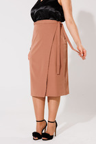 Юбка женская из экокожи. Перед юбки со швом посередине, переходящим в шлицу, с боковыми карманами и вытачками. Спинка со средним швом, заканчивающимся шлицей и вытачками. Застежка на тесьму молнию в переднем шве. Пояс притачной с эластичной резинкой сзади, с застежкой спереди на петлю и пуговицу. По швам проложены отделочные строчки. Изделие на подкладке.