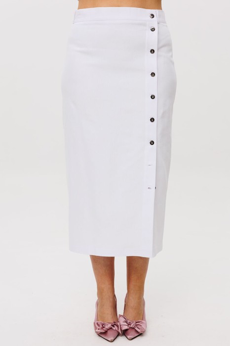 Кнопки спереди позволяют регулировать длину выреза, добавляя образу уникальность и удобство. Два кармана сзади не только придают юбке стильный вид, но и обеспечивают функциональность.