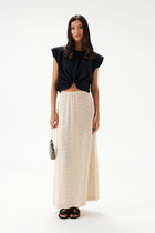 Юбка прямого кроя. Выполнена из костюмной ткани цвета хаки с оранжевой полоской. С подкладкой. Пояс стабильный. В среднем шве заднего полотна разрез (49 см). Застёжка молния в среднем шве заднего полотна. Длина юбки 96 см