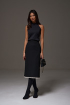 Юбка-миди полуприлегающего силуэта, выполнена из костюмной ткани черного цвета. Характеристика: прямой крой, пояс стабильный, подкладка, застёжка потайная тесьма молния в среднем шве со спины, в среднем шве заднего полотна изделия разрез 26 см. Длина юбки по боковому шву 75 см.