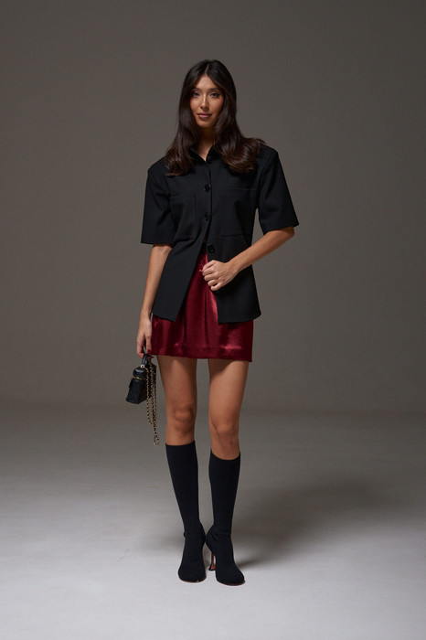 Юбка прямого кроя, выполнена из струящейся ткани бордового цвета. Характеристики: прямой крой, на подкладке, пояс на резинке. Длина по боковому шву 41 см.