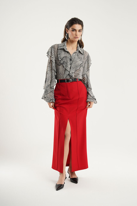 Юбка, прямая, в длине миди с разрезом по переду. В боковых швах карманы с отрезным бочком, сзади имитация кармана в рамку. Застежка на молнию и петлю с пуговицей. Пояс отрезной. Длина по боковому шву - 99 см.
