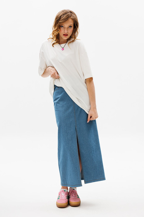 Юбка выполнена из джинса. Юбка прямого силуэта, на притачном поясе, длиной миди. Спереди застежка на пуговицу и молнию с гульфиком, боковые карманы с наклонным входом, кокетки и средний шов с разрезом. На задней части кокетка и накладные карманы. Юбка декорирована нашивками из натуральной кожи с тиснением.
