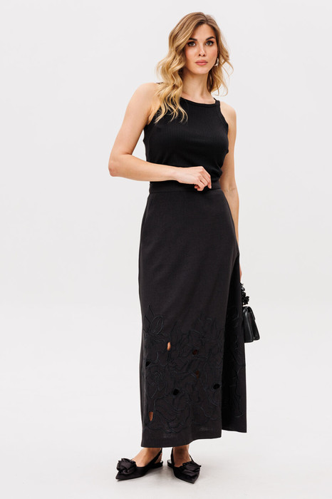 Юбка выполнена из плательной ткани. Юбка А-образного силуэта, длиной миди. Юбка на притачном поясе. Сзади в среднем шве застежка на потайную молнию. В боковых швах карманы с наклонным входом. Юбка декорирована по низу переда вышивкой с перфорацией. Юбка на отлетной по низу подкладке.