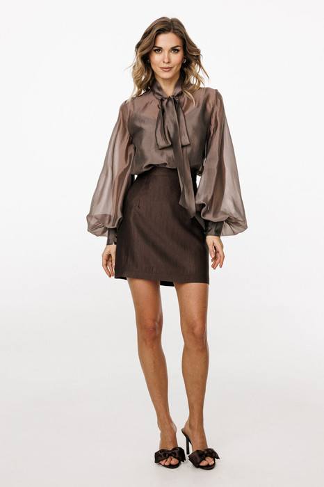 Юбка выполнена из костюмной ткани. Юбка прямого силуэта, длиной выше линии колена. Переднее полотнище цельное. Сзади в среднем шве застежка на потайную молнию.