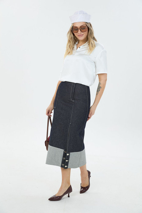 Джинсовая юбка длины миди с высоким разрезом по переду и боковым карманом с одной стороны. Застёжка юбки  ассиметричная в виде молнии и пуговицы.  По низу  юбки выполнен подворот с имитиацией застёжки на пуговицы.