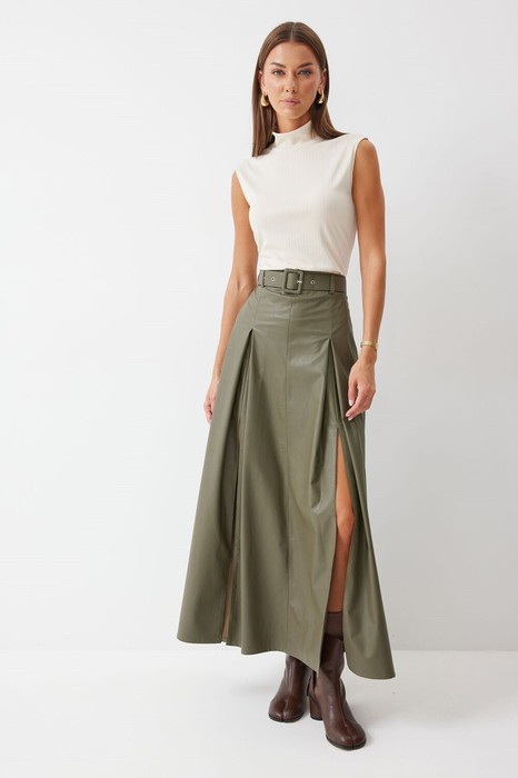 Стильная юбка А-силуэта из экокожи , длины макси. По верху юбки притачной пояс с  шлевками для ремня.  На передних половинках расположены вытачки со встречной складкой и разрезами по низу. На задних половинках расположены талиевые вытачки. На спинке по центру потайная молния. В комплект входит ремень.