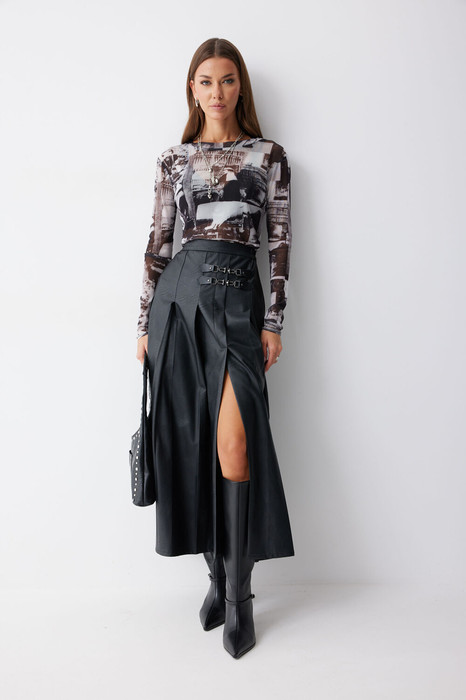 Юбка А-силуэта из экокожи на хлопковой основе длины макси.  По верху юбки притачной пояс со  шлевками для ремня. Переднее полотнище юбки со складками и шлицей  и декоративной  фурнитурой. На задних половинках расположены талиевые вытачки. На спинке в центральном шве потайная молния. По бокам в поясе вставлена резинка от складки до вытачки.