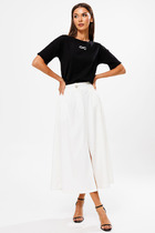 Юбка длиной миди прямая на резинке. Карманы в боковых швах. Разрез по переду.