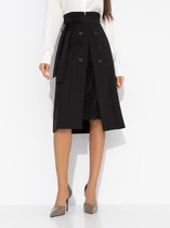 Юбка длиной миди, расклешенная к низу, с асимметричным низом. Пояс притачной, по спинке собран на резинку. Переднее полотнище состоит из трех частей. Правая часть скреплена отделочной строчкой и кнопками. В боковых швах изделия расположены карманы. По спинке изделия идёт средний шов и две вытачки для удачной посадки по фигуре. Юбка без подкладки.