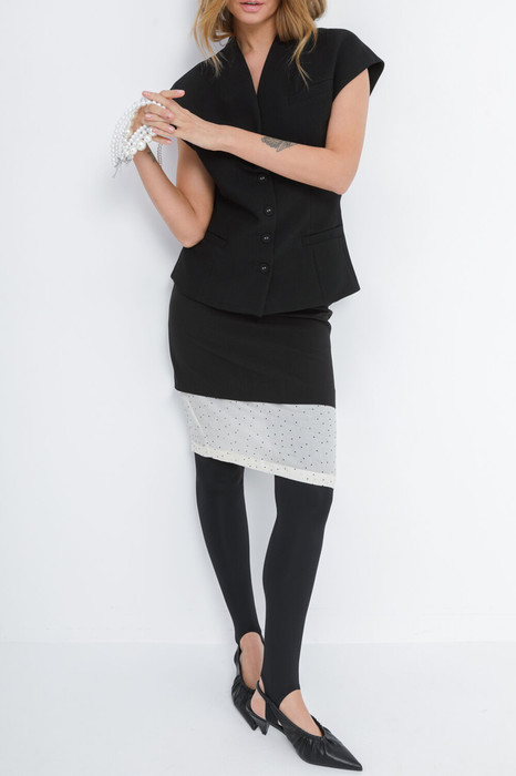 Детали: высокая посадка, талиевые вытачки, застежка на потайную молнию по спинке, на подкладке. Нижняя часть юбки из полупрозрачной текстильной ткани с флоковыми горошками и высоким разрезом.