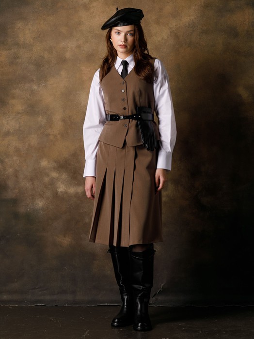 Модель А-образного силуэта, без подклада, на подкройном поясе. На поясе шлёвка и застёжка на петли и пуговицы. Спереди частично застрочены односторонние складки.