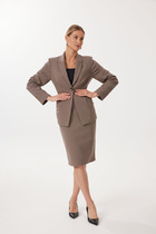 Юбка женская на подкладке, длиной мини. Юбка имеет слегка расширенную к низу форму, переднее полотнище из двух частей с имитацией запаха и застежки на декоративные пуговицы. Подкладка юбки с красивой кружевной деталью по низу, кружево на 3-4 см «выглядывает» из-под нижнего края юбки. Застежка в боковом шве на потайную застежку-молнию. Верхний край юбки обработан обтачкой, по заднему полотнищу обработаны талиевые вытачки. Длина 47 см.