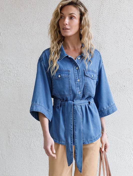 Удлиненная блузка с поясом и карманами из джинсового лиоцелла
