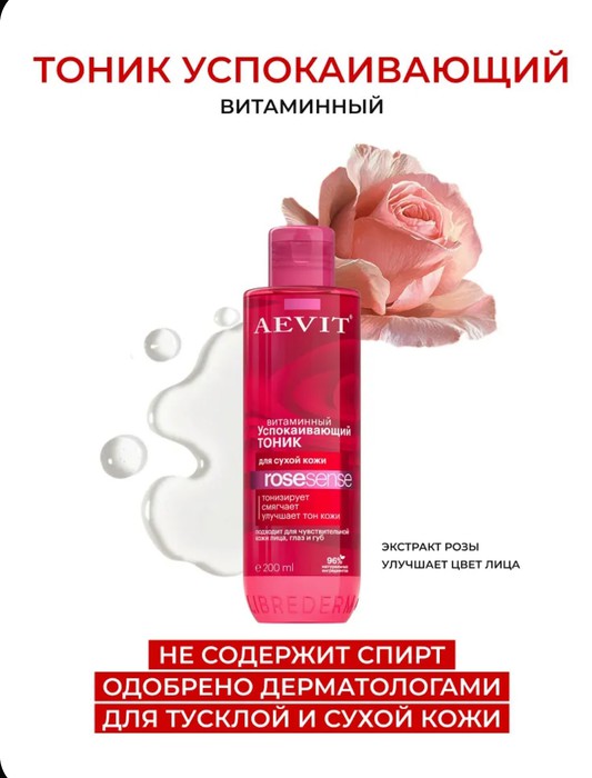 Тоник для лица успокаивающий витаминный для тусклой и сухой кожи завершает процедуру снятия макияжа, восстанавливает pH-баланс кожи, подготавливая ее к дальнейшему нанесению уходовых средств. Синергия витаминов А и Е обеспечивает мощное антиоксидантное воздействие, защищает клетки от старения, смягчает и успокаивает кожу. Натуральная розовая вода из лепестков средиземноморской дамасской розы эффективно тонизирует кожу и улучшает цвет лица.