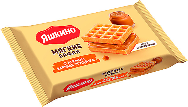 В упаковке сэндвич из двух мягких вафель с прослойкой из варёной сгущёнки.