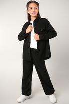 Свободная рубашка с нагрудными карманами и свободные штаны джоггеры на резинке создают комфортный брючный комплект. Черный костюм в рубчик станет универсальным решением: он подойдёт как школьный вариант, а также отлично впишется в повседневный гардероб девочки подростка.