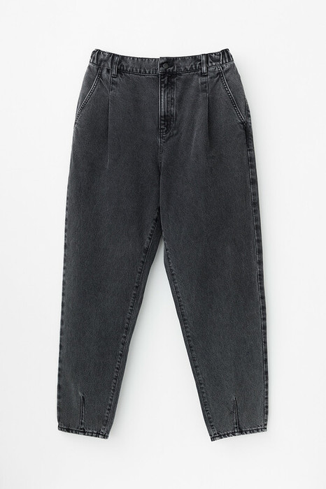 Женские джинсы из 100% хлопка свободного кроя, зауженные книзу, с поясом на резинке и завышенной линией талии. Модель с классическими 5 карманами и подворотами.