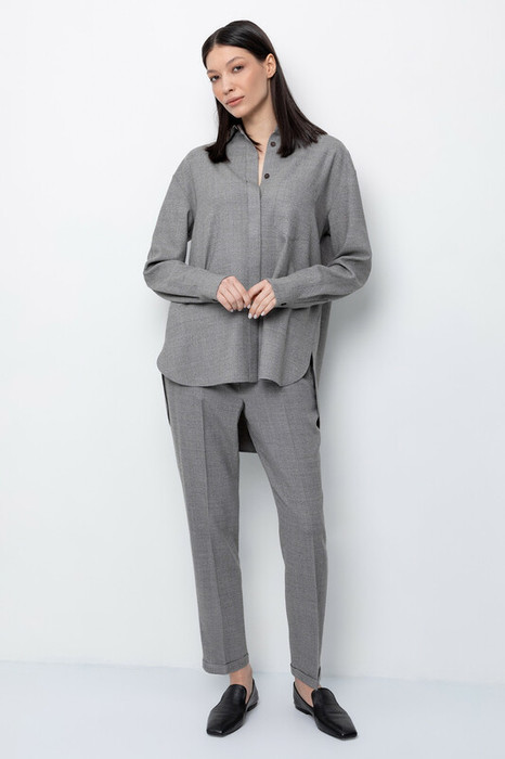 Брюки из мягкой меланжевой ткани с добавлением шерсти прямого силуэта, слегка зауженные книзу, с боковыми карманами, заутюженными стрелками и подворотами. Комфортый пояс на резинке.