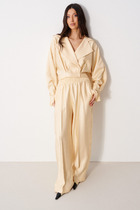 Пояс регулируется вязаным шнуром в тон брюк. Плотная фактура вязания согревает и сохраняет форму во время носки.