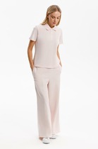 Брюки из мягкого двухцветного футера. Внутренняя сторона изделия представлена в натуральном цвете хлопка, внешняя в нежно-розовом. За счет использования крашенной пряжи, данный вид полотна прошел минимальную обработку, что придало изделию мягкость и шелковистость.