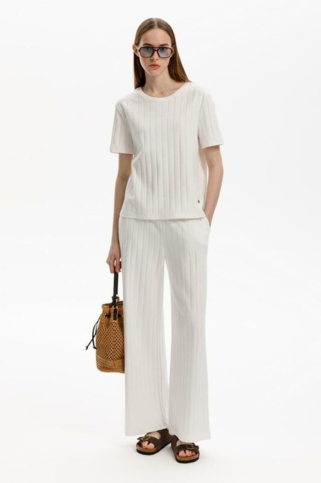 Свободные летние брюки из 100% гребенного хлопка. Необычное переплетение в виде широких полос придает изделию оригинальность, добавляя фактуры и динамики в образ. В сочетании с футболкой из этой коллекции, вы создадите стильный образ для летних дней.