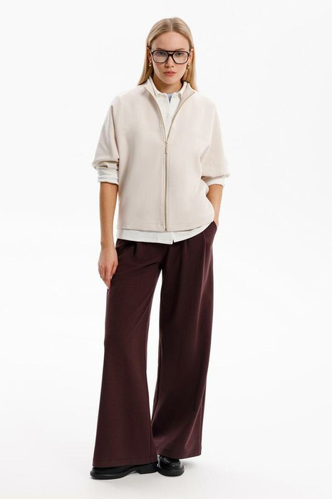 Брюки с защипами на талии, изготовленные из премиального трикотажа DOUBLE FACE, дарят ощущение комфорта и легкости. Складки спереди придают изделию свободный силуэт.