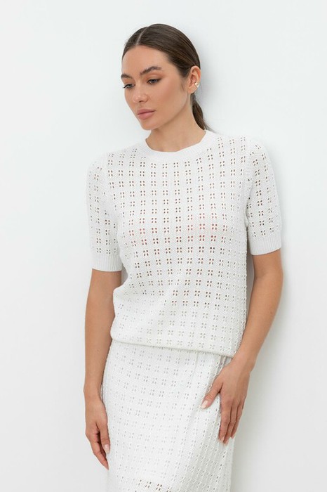 Укороченная вязаная ажурная футболка. Манжеты и пояс, связаные ластиком, придают изделию небольшой объем. Состав 50% хлопок, 50% акрил. Благодаря акрилу в составе изделие не пилингуется.