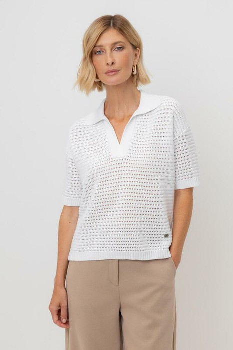 Воздушное поло ажурной вязки из итальянского хлопка. Мягкий воротник без застежки в стиле поло и спущенная линия плеча добавляет легкости при создании летних образов.