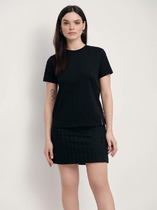 Базовый джемпер с короткими рукавами и воротником-стойкой из плотного однотонного трикотажа супрем с добавлением спандекса.