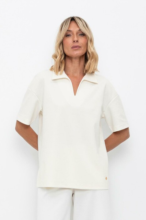 Джемпер поло с короткими рукавами из плотного гладкого трикотажа интерлок с V-образным вырезом. Спущенное плечо придает изделию свободный силуэт.