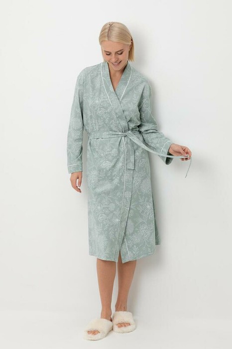 Уютный легкий халат из набивного трикотажа на запах с длинными рукавами. В боковых швах два удобных кармана. С помощью пояса можно регулировать посадку и силуэт. Гладкий материал приятен к телу и позволяет коже дышать.