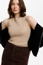 Базовым элементом гардероба является топ из эластичного трикотажа в рубчик. Широкое плечо и высокий вырез делают изделие комфортным и универсальным в носке.