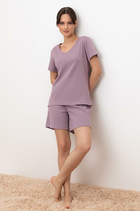 Комплект для комфортного сна и отдыха из трикотажного полотна в рубчик. Свободная футболка с V- образным вырезом. Шорты с мягким поясом на резинке удобно садятся по фигуре.